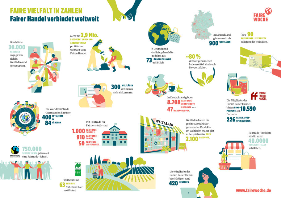 Die Faire Woche wird vom Forum Fairer Handel e.V. in Kooperation mit dem Weltladen- Dachverband e.V. und Fairtrade Deutschland e.V. veranstaltet – 2025 bereits zum 24. Mal. Mit rund 2.000
